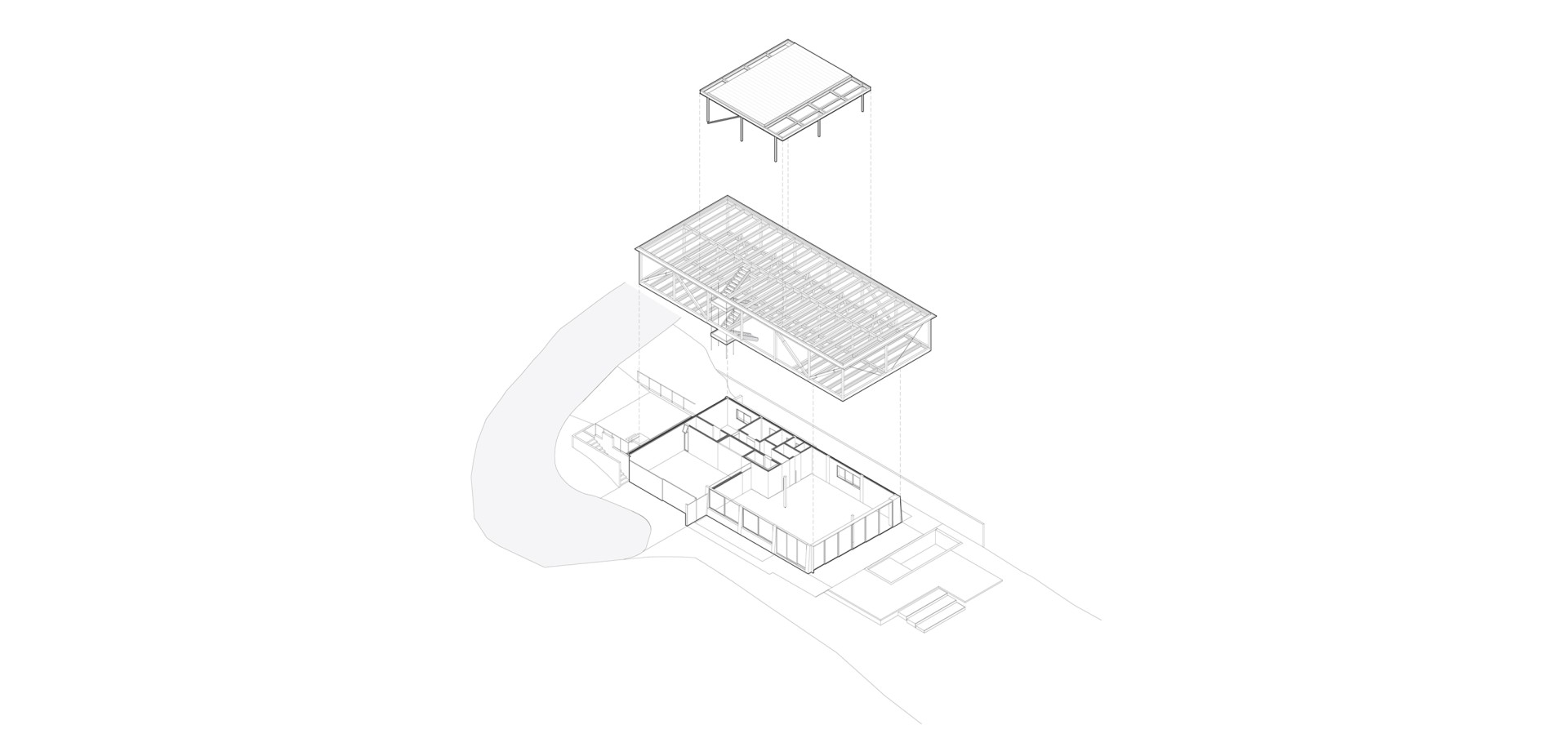 To achieve this, we took advantage of the natural slope of the land and the possibility of access from two different levels to establish separate entrances for the two uses. Since the legal plot is not large (despite the generous non-buildable maritime zone that extends the house’s garden all the way to the beach), we chose to design a single built volume that wouldn’t indicate the programmatic division in its form.