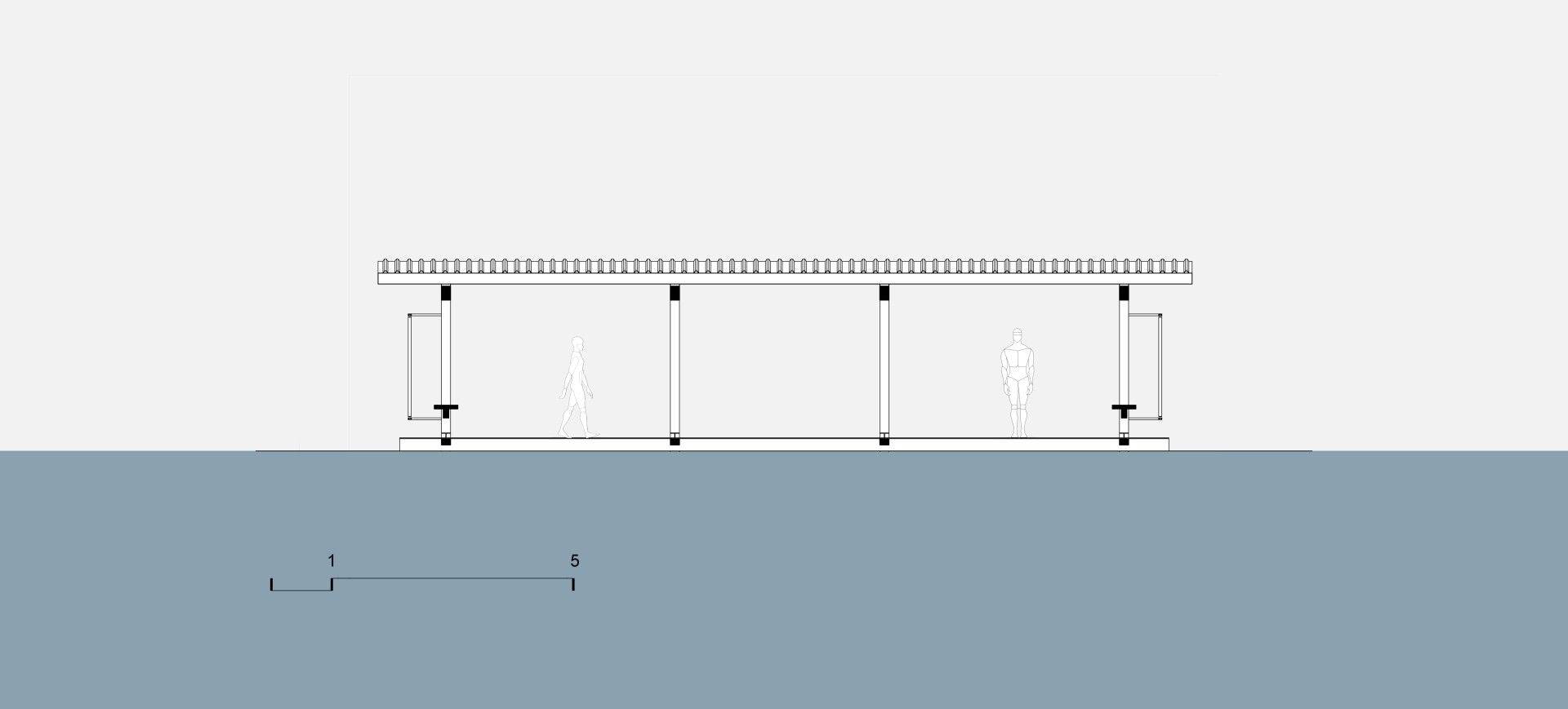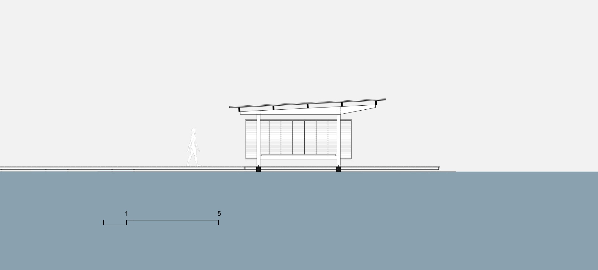 O pavilhão flutuante, portanto, se caracteriza por uma singela cobertura implantada sobre um deck, configurado apenas por dois planos, de piso e de teto, que por sua vez garantem o lazer e contemplação.