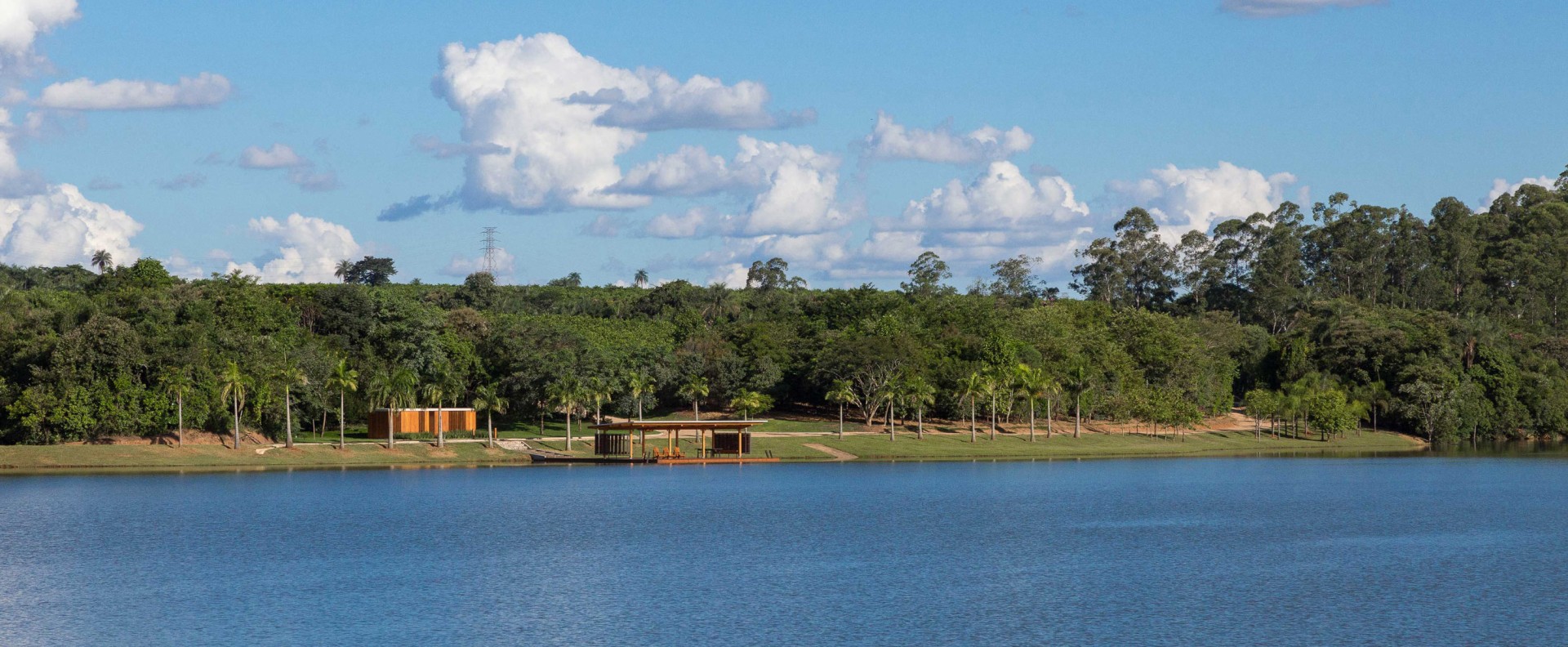Um plano, que produz sombra, sobre a água. O pavilhão flutuante representa uma obra sem limites claros, sem começo nem fim, mimetizada na paisagem, sobre o território difuso e reflexivo das águas de uma represa no interior de São Paulo.