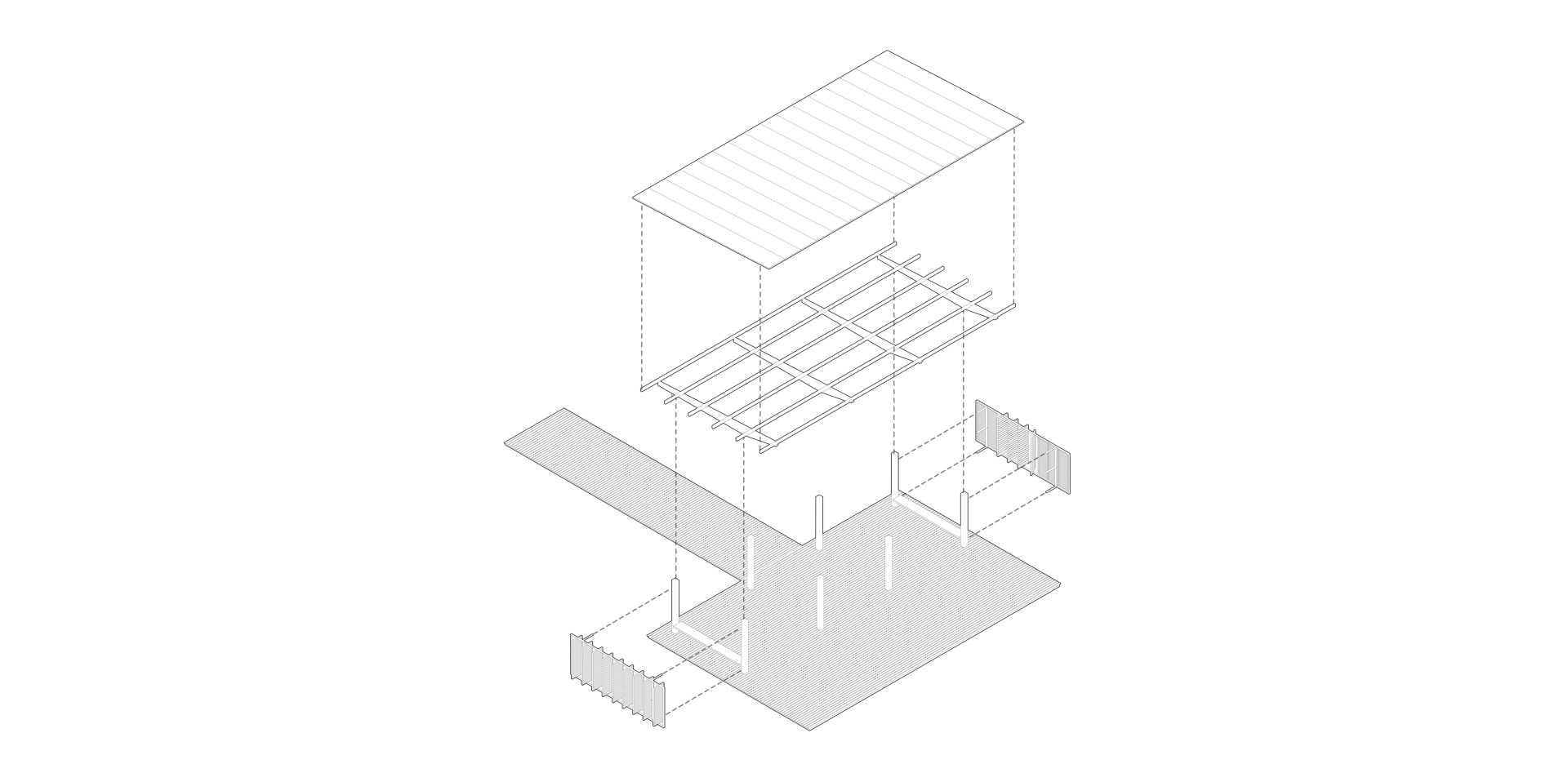 Therefore, the floating pavilion, is defined as a simple roof over a deck, appearing as just two plans, floor and ceiling, which assure leisure and contemplation.