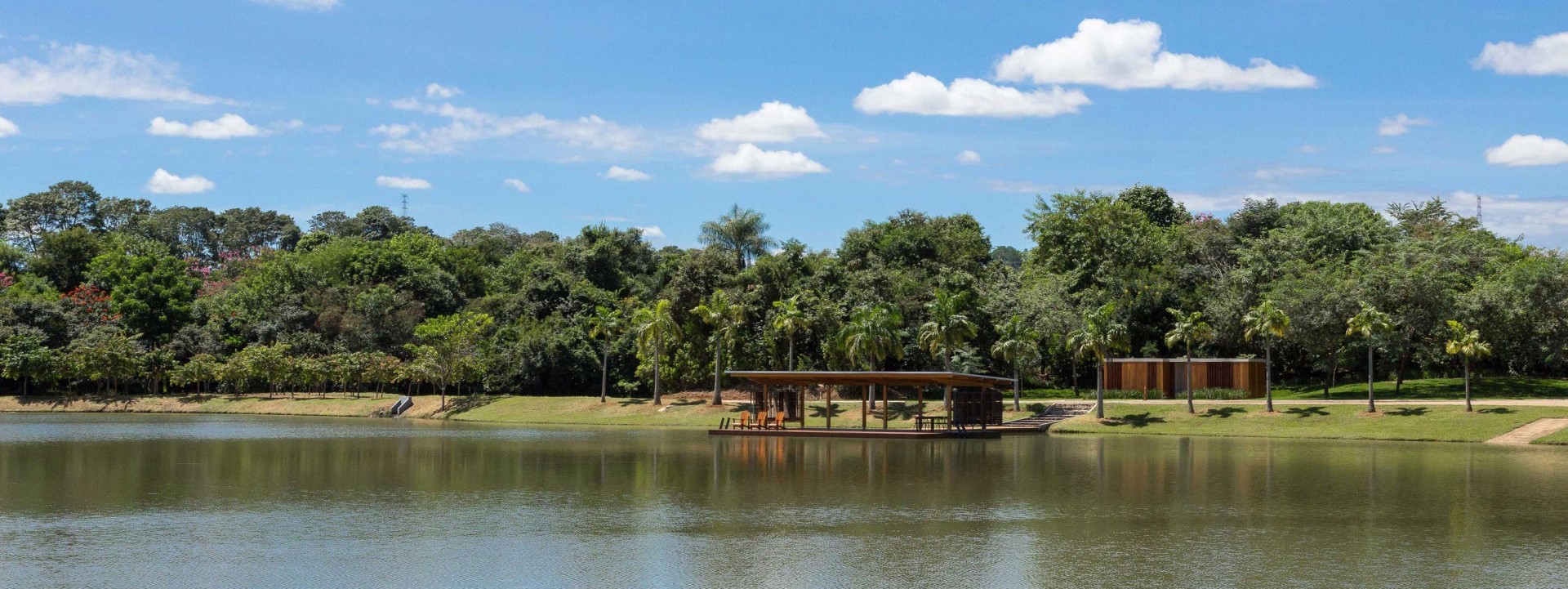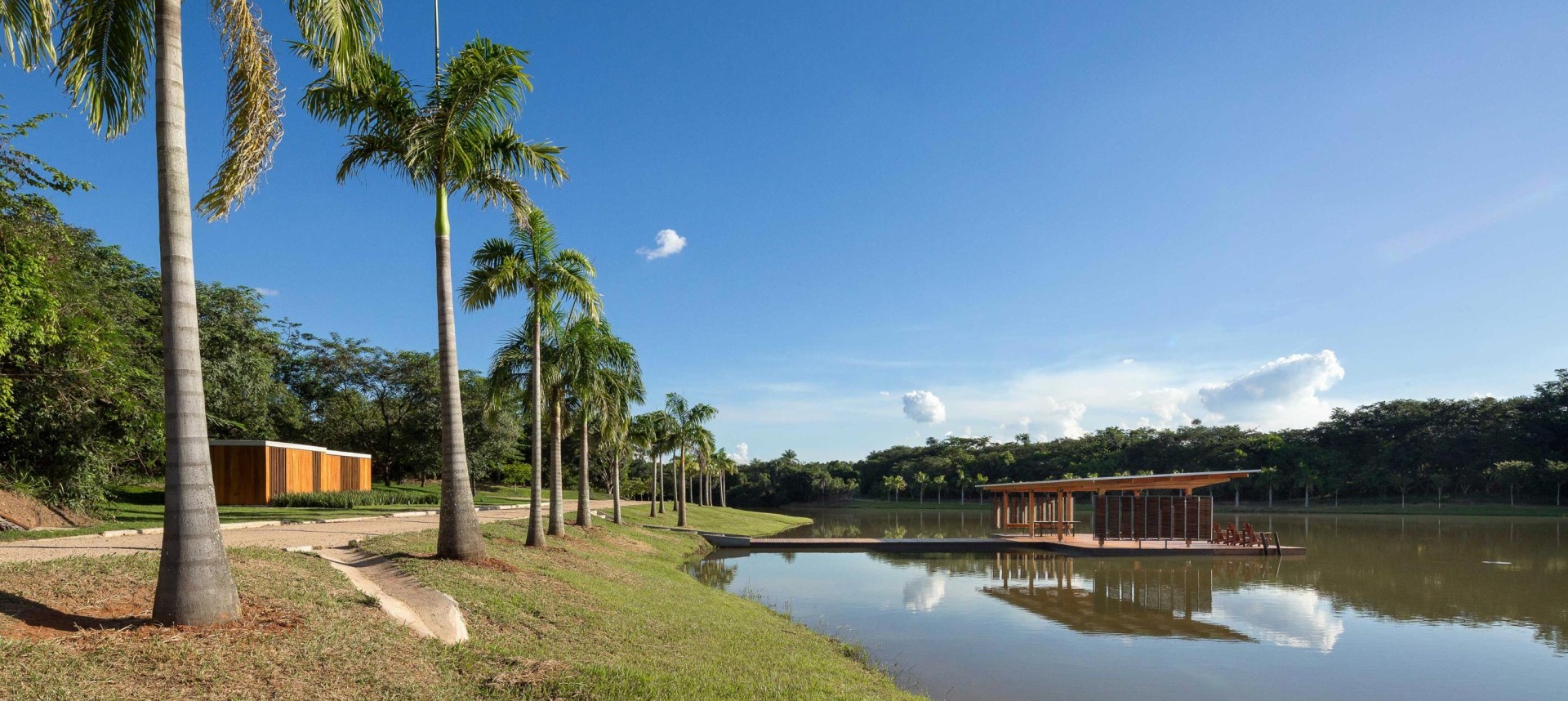 A shading plane over the water. The floating pavilion represents a building with no clear boundaries, without beginning or end, mimetized in the landscape, over the diffusive and reflexive territory of a water containment basin in a farm on the interior of São Paulo state – Brazil.