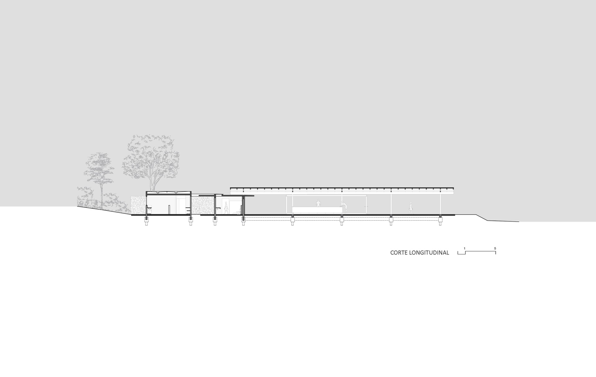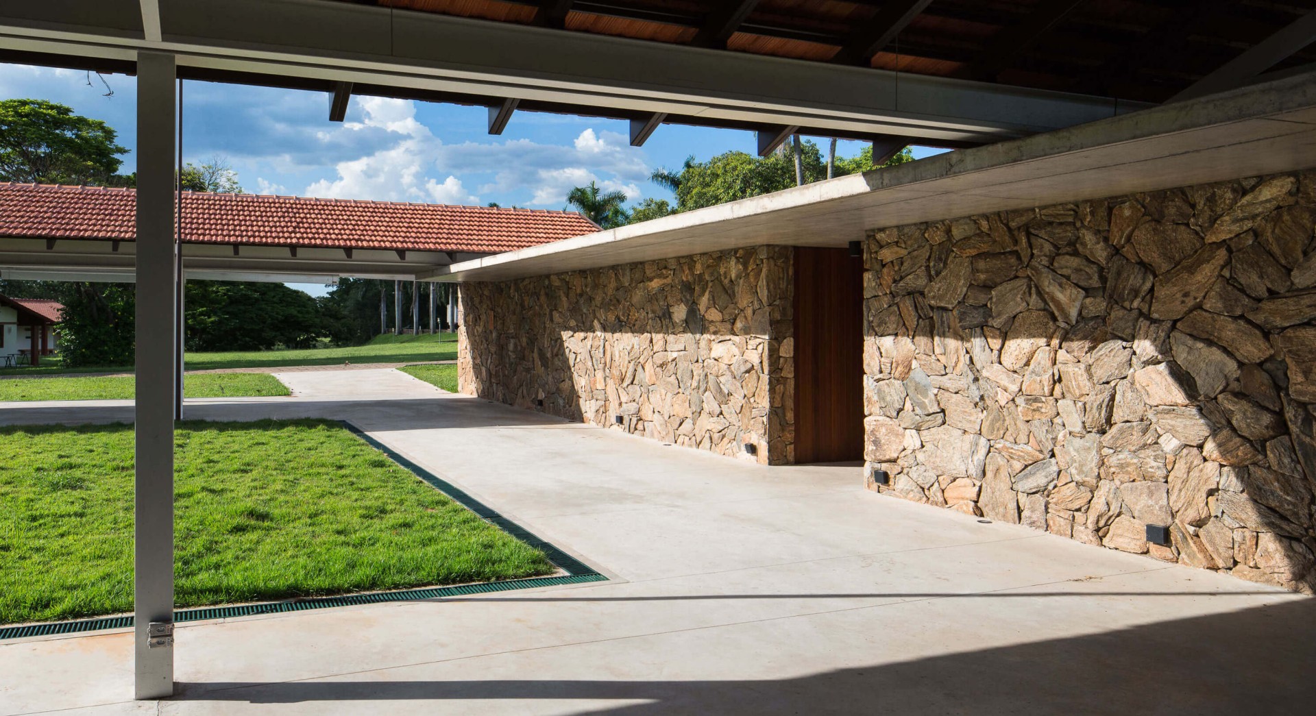 Two pavilions, with no established programs, provide large shade shelters to welcome the guests. Resting on the services building, this composition creates a patio, which is the main stage for cattle exhibition during events. Both pavilions have a gable roof covered in ceramic tiles, referring to original buildings in the farm. On the other hand, the main system is conceived in steel frame, ensuring a fast and easy construction, besides bringing a contemporary atmosphere.