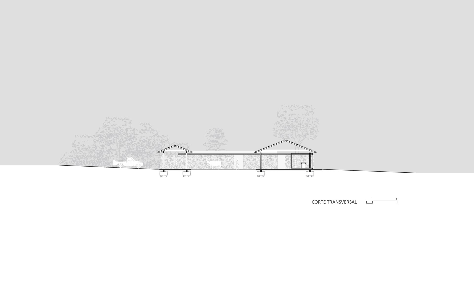Clad in rough stone, the services building evokes traditional construction techniques, making allusion to the farm environment, while creating a coherent harmony between architecture and nature. Facilities here include restrooms, kitchen, dressing rooms for employees and other required services to cattle auctions.
