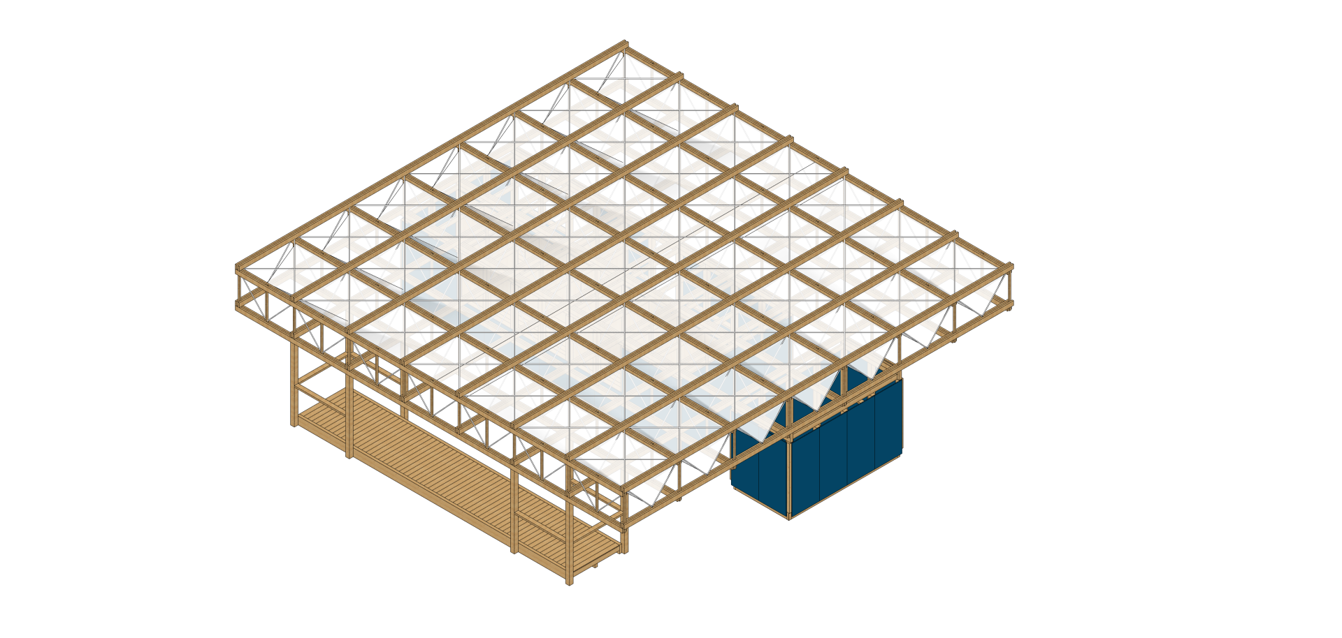 The first relevant issue was to think about a structure using Criptomérica dos Açores wood, typical of the region, combined with the need for it to be somewhat self-supporting, that is, not to depend on foundations or propped supports that would damage the floor of the square, not even the infrastructure. To achieve this, a support system was designed with two main volumes that rest on the floor.