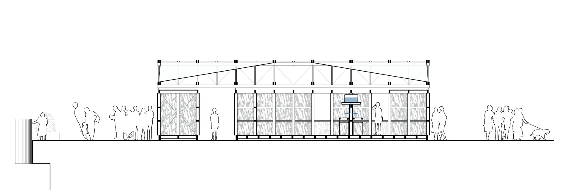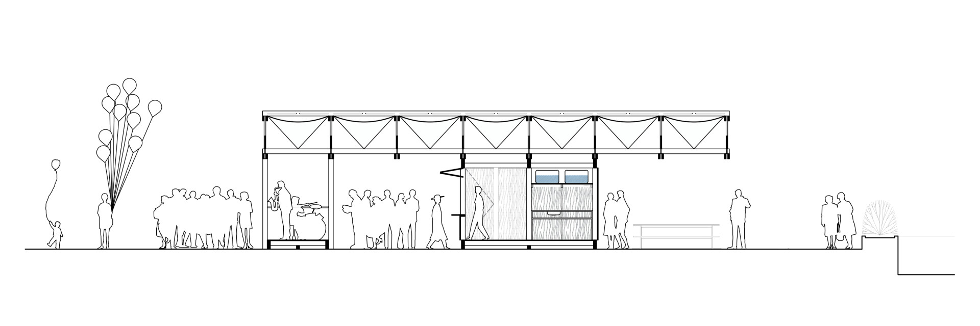 In the first, larger one, there are all the rooms with programs that need to be closed, with the necessary interactions with the open areas, such as the bar and pantry, the sound booth and the deposits for drinks, equipment and furniture. This block has wooden profiles forming a woodframe-type system, and is closed with painted raw wood sheets that, in addition to guaranteeing watertightness, privacy and security in closed areas, serve as support for advertising, programming and sponsors.