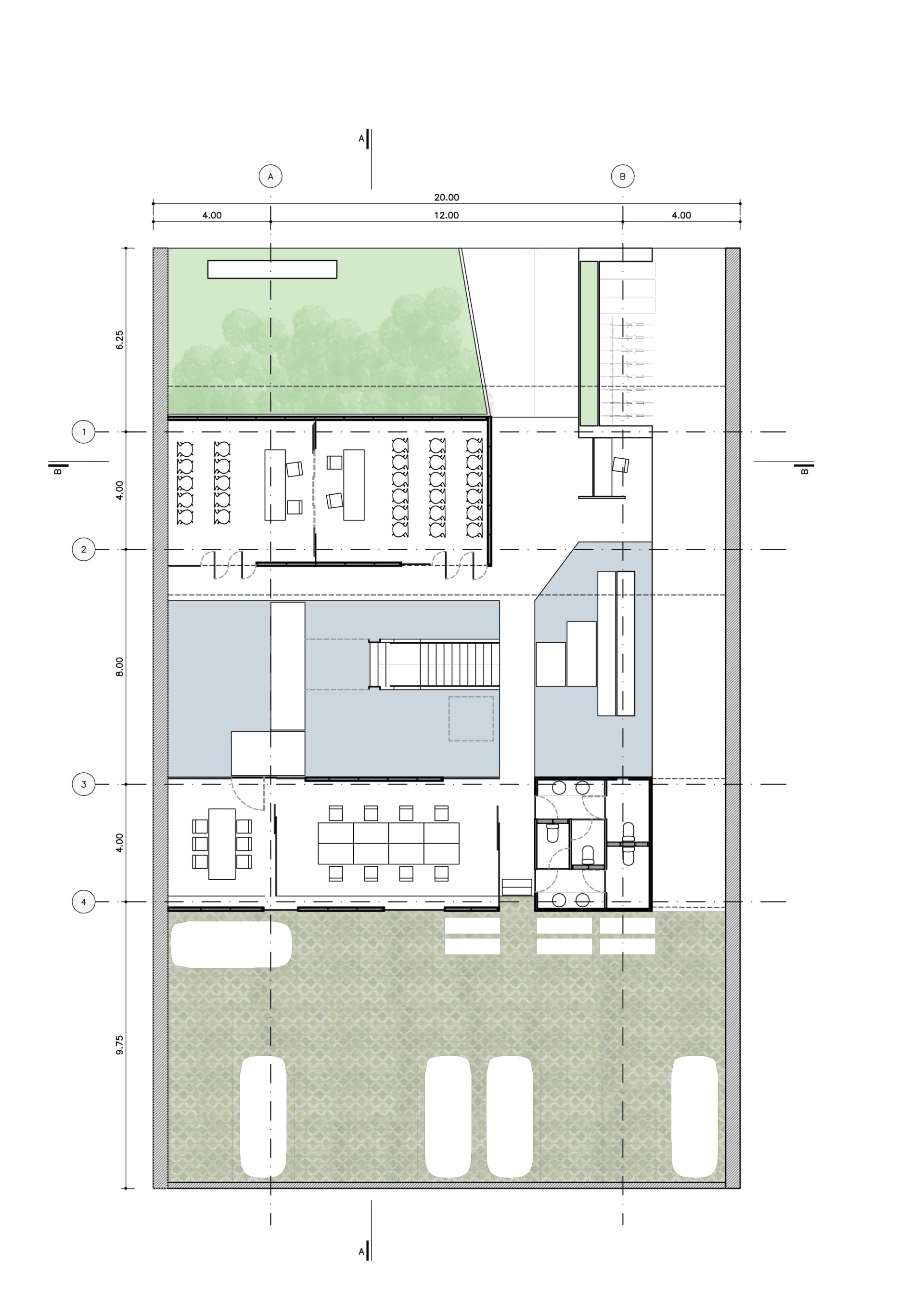 Desta maneira, tem-se um térreo livre, franco e fresco. Os programas nele inseridos dedicam atenção ao público direto e recebem um revestimento em madeira. Já os programas mais privados seguem nos volumes metálicos do andar superior.