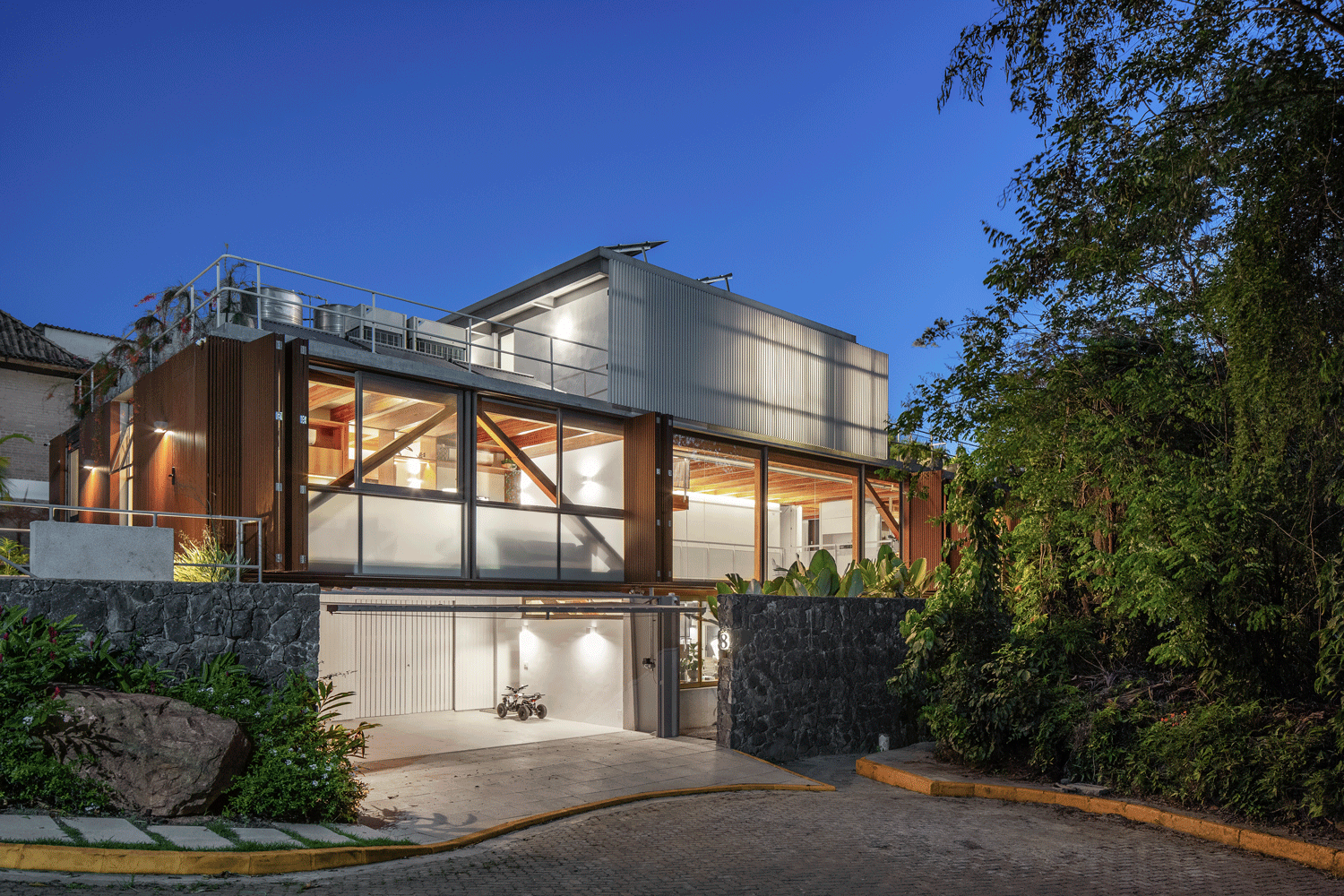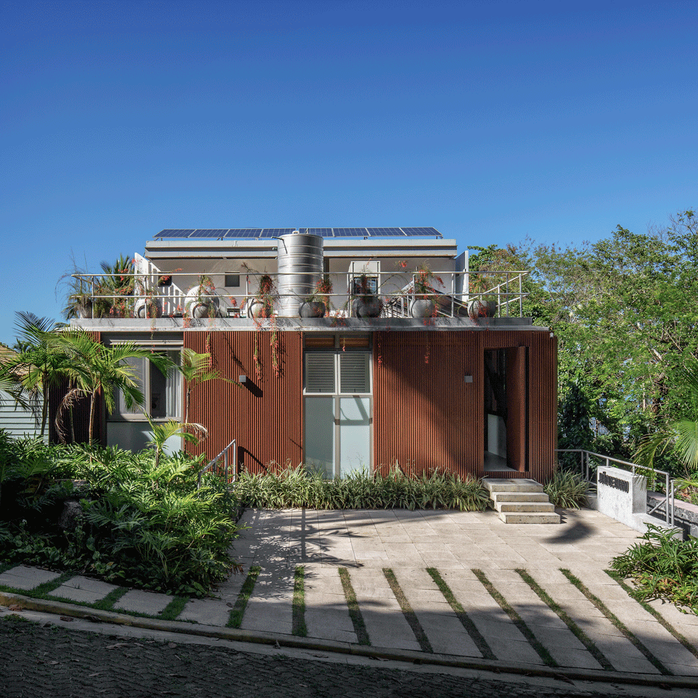 A cota superior da rua dá acesso à casa para aluguel, que conta com dois quartos, e aberturas e visuais para a densa mata atlântica do morro que circunda o terreno. Já na cota inferior, no final da rua, se dá o acesso de veículos e áreas comuns da casa principal que se estendem pelo jardim até a areia da praia.
