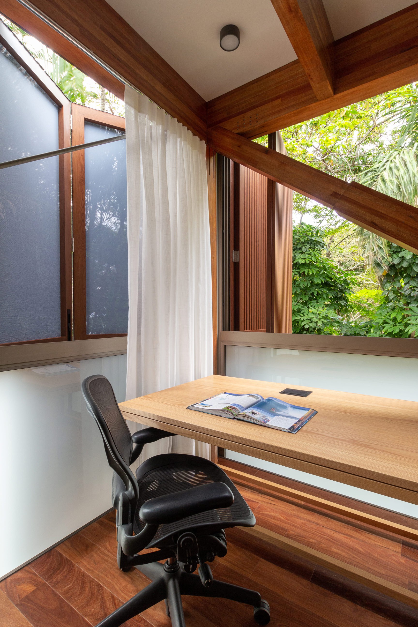 O bloco do primeiro pavimento, todo em madeira laminada colada – MLC, pousa sobre o térreo e contempla os quartos e escritório da casa principal, além de toda a casa de aluguel. Este corpo construído é todo pré-fabricado com lajes secas e sistema de divisórias leves, e permite grandes aberturas para os visuais do mar e da grande mata que circunda a casa. Este elemento permite uma estrutura leve e esbelta, além de uma montagem muito rápida no canteiro.