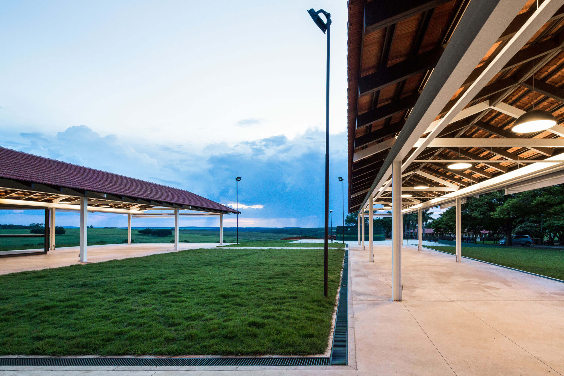 Os dois pavilhões livres de programas fixos, configuram sombras de proteção para receber os visitantes. Estes se apoiam no bloco de serviços, conformando o pátio, palco central para exposição dos gados e convívio nos eventos. Os pavilhões têm sua cobertura em telhas cerâmicas de duas águas, fazendo referência direta às construções originais da fazenda. Em contraposição, a estrutura principal é concebida em um sistema de pilares e vigas metálicas, trazendo uma atmosfera contemporânea, além de garantir rápida execução e baixa manutenção.
